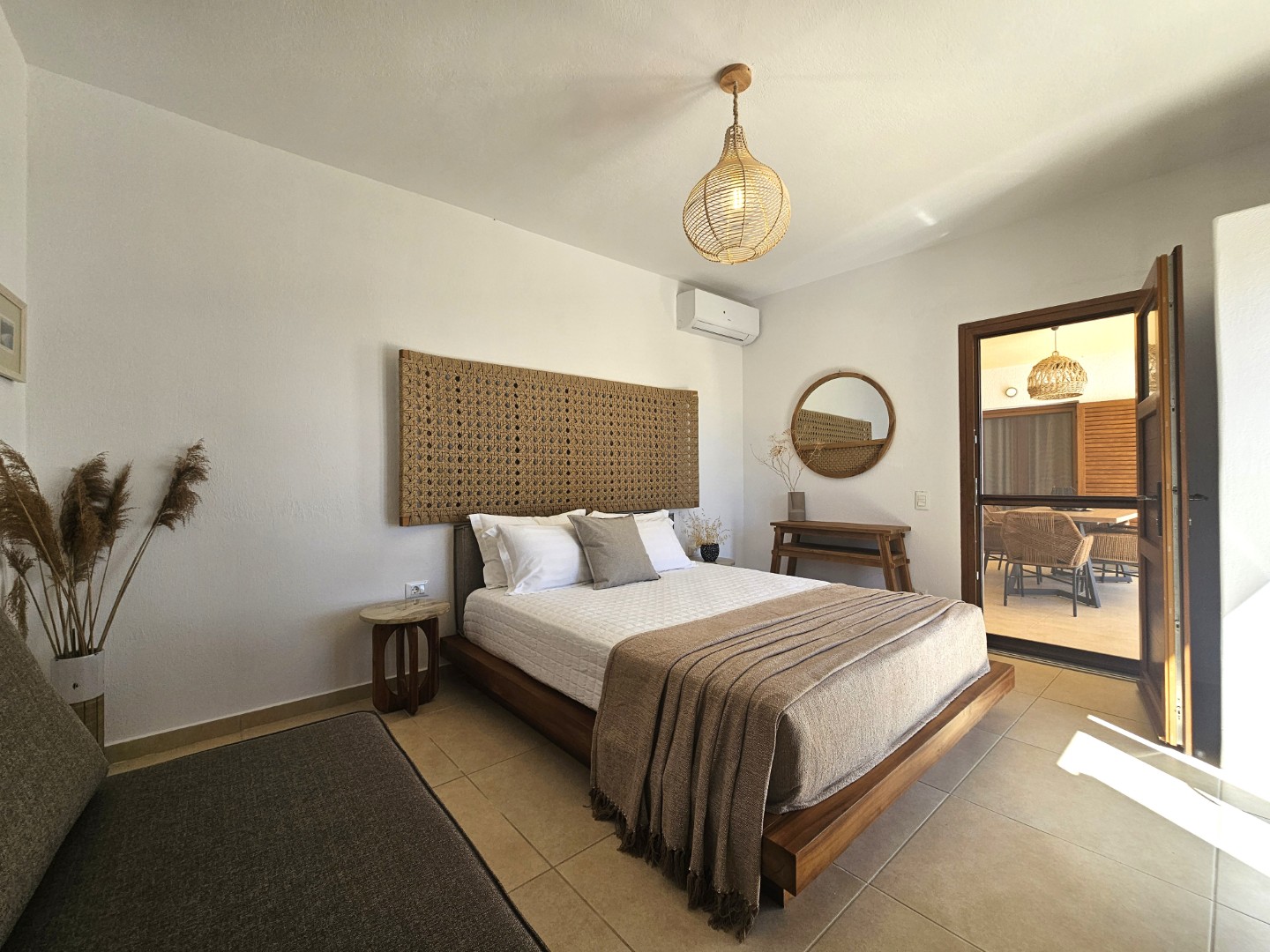 The property features a master bedroom with an en-suite bathroom with shower on the upper floor with its own entrance and a beautiful private balcony offering unobstructed views to the Aegean Sea. On the same level this villa provides a separated area comprising of a spacious open-plan living room and dining area with amazing views to the pool area and the Aegean Sea, a fully equipped kitchen with minimal design and modern aesthetics, a bathroom with shower and a loft in the upper floor with a king-sized bedroom.