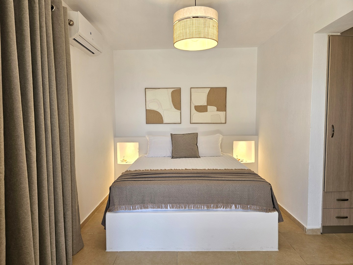 The third 35 sqm apartment is again studio style with a mini fridge, double bed, bathroom with shower, flat smart TV and HI-FI stereo. This apartment also has an outdoor shaded lounge area.